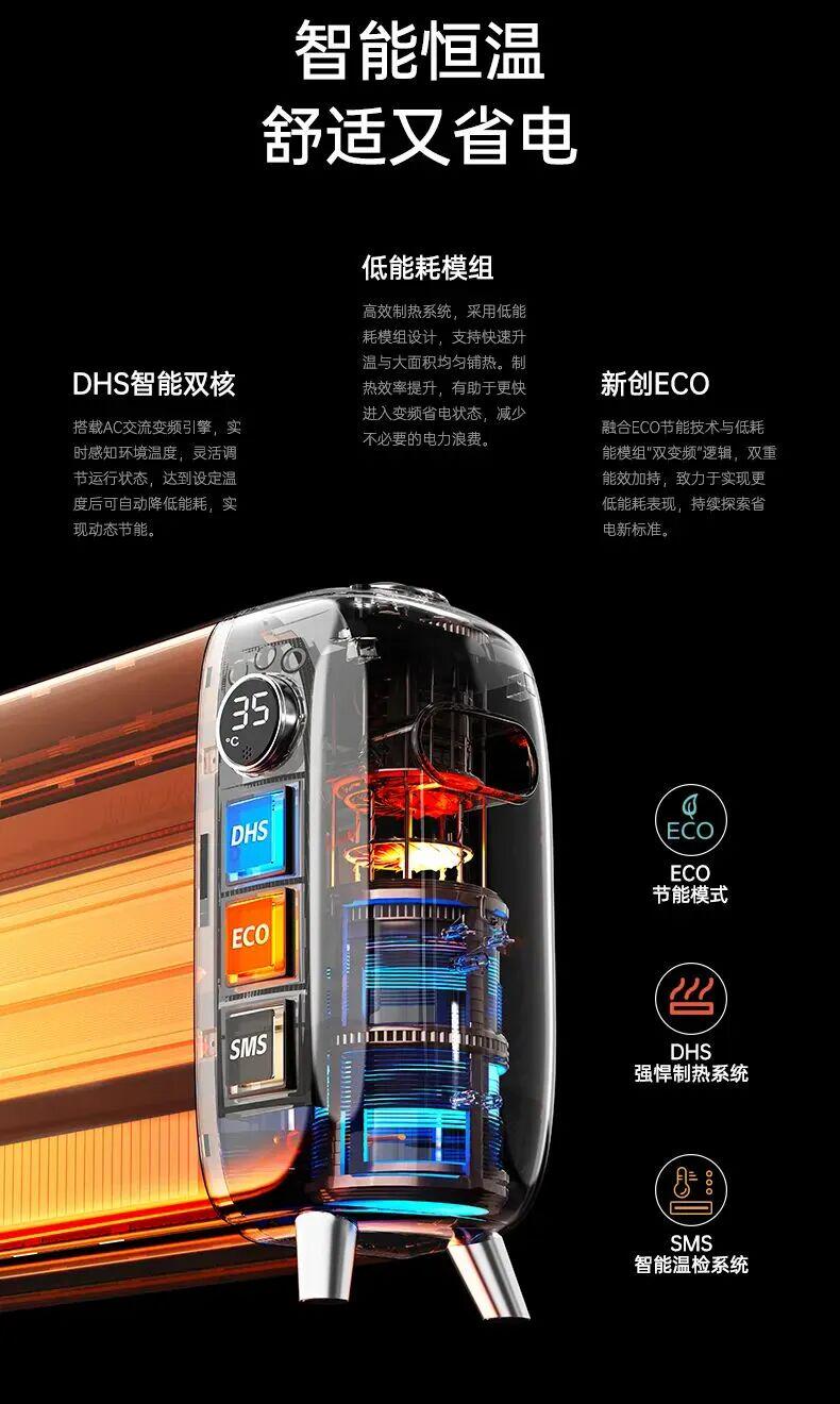 ✅双擎发热体,热对流+热辐射双向供暖模式,能暖近 40㎡的屋子,大客厅也够用