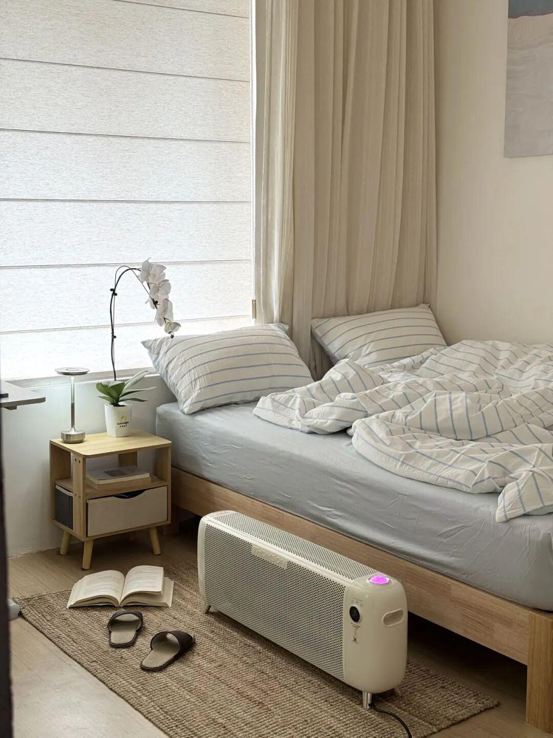 ✅在二十平米的房间,将电暖器统一放在在图片右侧靠近床头的位置。