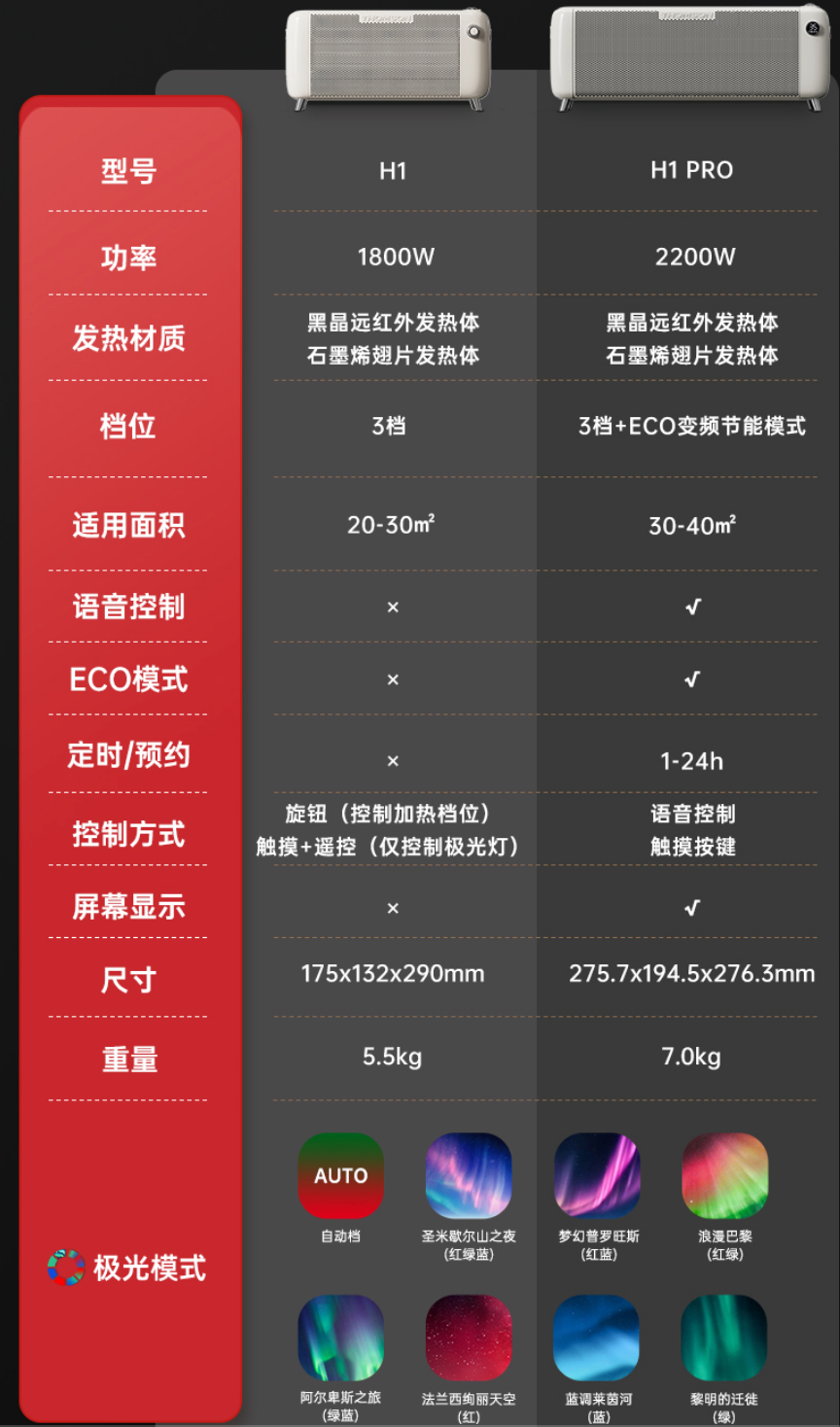 【极光】H1Pro智能语音款:2200w,适合30-40㎡的空间。