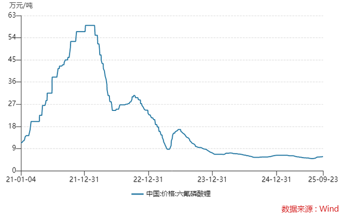 六氟磷酸锂价格自2022年初创下了59万元/吨的峰值后,便历经两年断崖式的下行周期。2024年以来,其价格已进入筑底周期,在7万元/吨下方波动,9月23日的最新报价为5.75万元/吨。