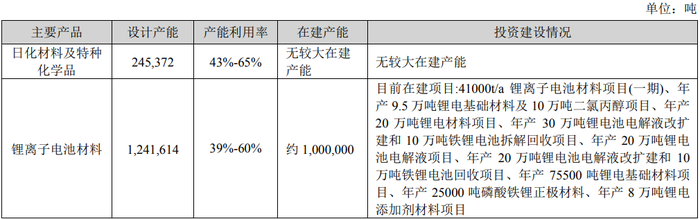 电解液行业近两年产能过剩明显。去年年报显示,天赐材料锂电池材料设计产能124.16万吨,产能利用率在39%至60%之间。同时公司有在建产能约100万吨。锂电池材料除了电解液外,还有包括其他基础材料、正极材料、添加剂等产能。